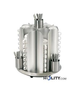 Calientatazas profesional giratorio de acero, capacidad para 48 tazas (Ø 90 mm), con 4 compartimentos para cucharillas y temperatura regulable hasta 45 °C.