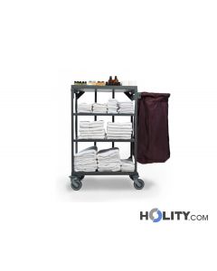 Carro de ropa para hotel en acero y aluminio con portasacos de 130L, 2 estantes fijos y bandeja superior para kit de bienvenida. Capacidad de carga 150 kg.