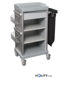 Carro de servicio para recogida de ropa sucia y distribución de ropa limpia. Equipado con un portabolsas y dos cajones. Dimensiones:140x52x130cm