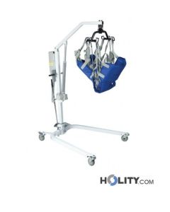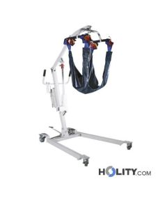 Elevador de pacientes eléctrico en acero pintado con base regulable en anchura. Posibilidad de levantar al paciente del suelo. Capacidad máxima: 150 kg.