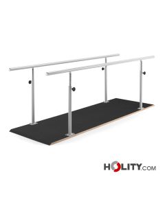 Paralela para rehabilitación con pasamanos. Longitud de la plataforma: 250 cm. Suelo de madera revestido de goma antideslizante. Capacidad: 160 kg.