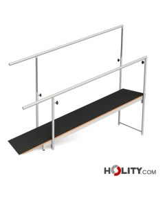 Paralela para caminar completa con superficie para caminar y rampas de acceso. Pasamanos de madera. Material del armazón: acero pintado.
