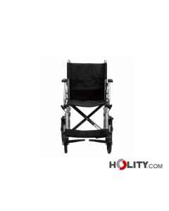 Silla de ruedas plegable con estructura de aluminio pintado. Equipada con cinturón de seguridad y respaldo plegable. Capacidad máxima de carga: 75 kg.